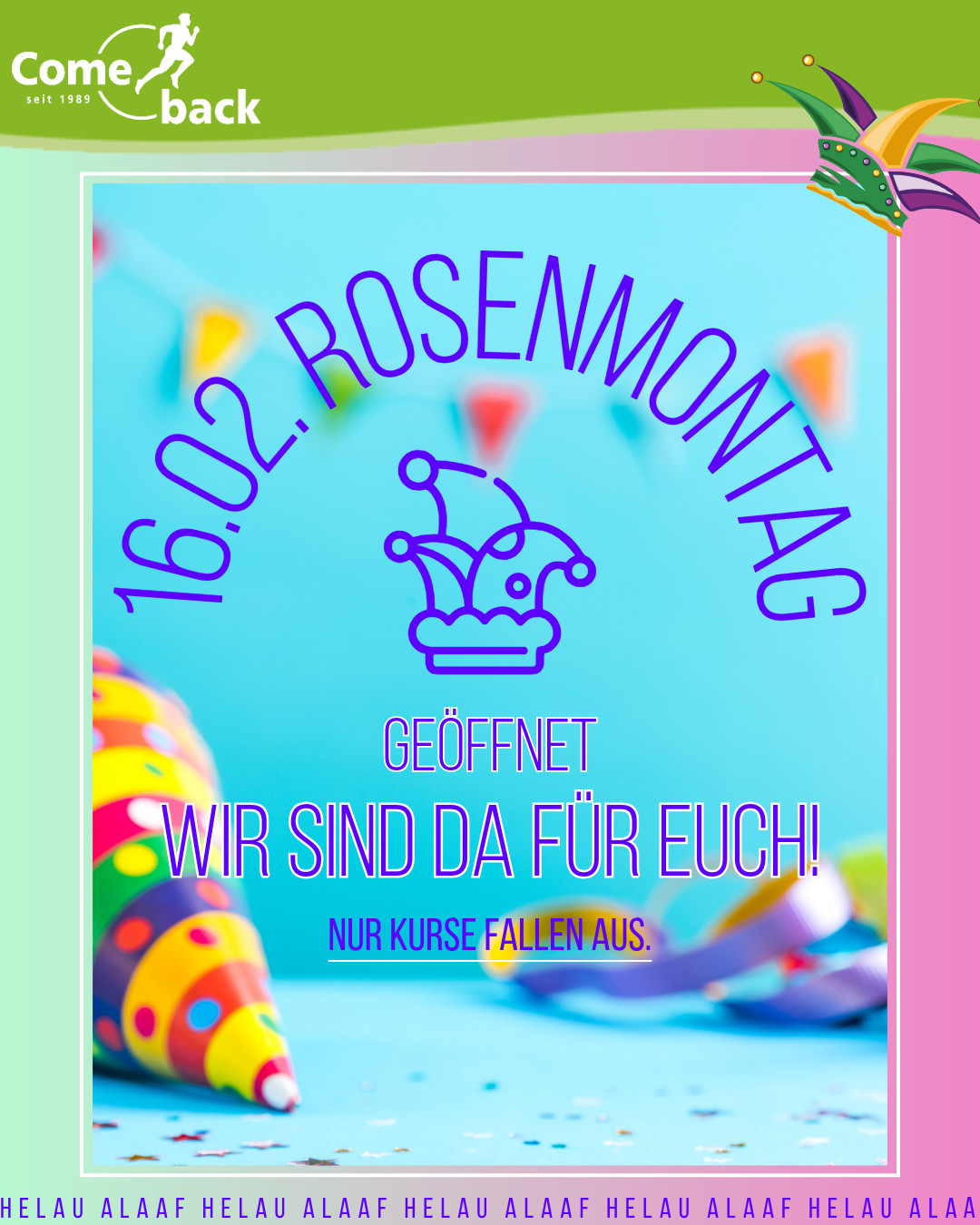 Helau & Alaaf! Auch an Rosenmontag lassen wir euch nicht hängen. Unsere Trainingsfläche ist wie gewohnt geöffnet und ihr könnt ganz normal trainieren. Bitte Beachtet:Unsere