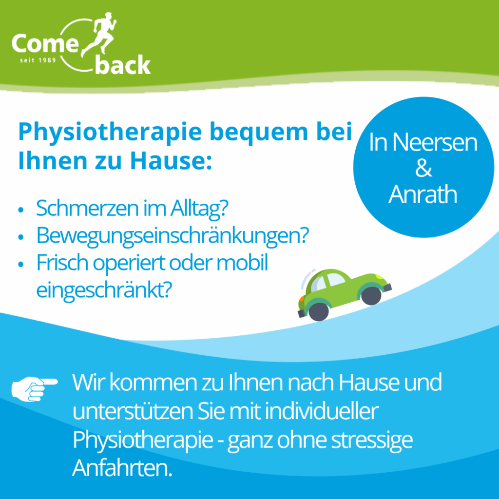Physiotherapie direkt bei Dir zuhause – jetzt auch in Neersen und Anrath! Wir kommen zu Dir nach Hause und unterstützen Dich mit individueller Physiotherapie –